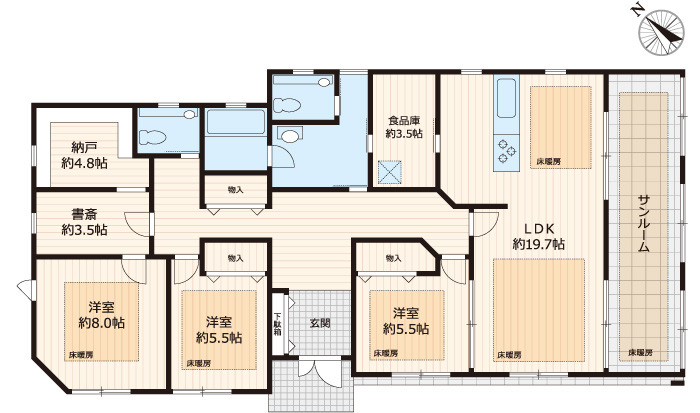 | 間取 | 3SLDK + 納戸4.8帖、パントリー3.5帖、書斎3.5帖 (LDK19.7帖、洋室5.5帖、洋室5.5帖、洋室8.0帖、S4.8帖、S3.5帖、S3.5帖) | ||