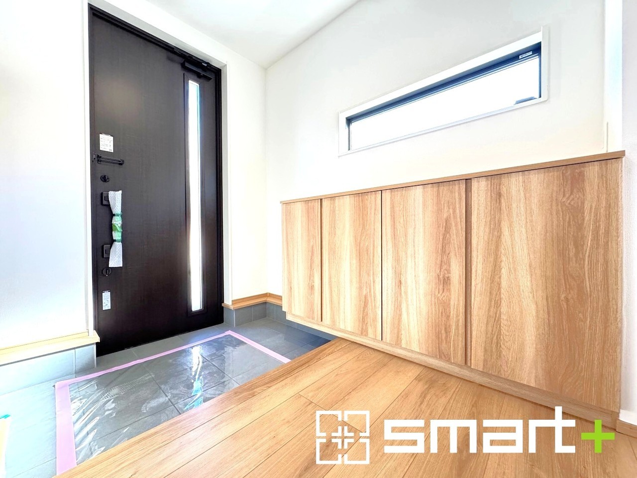 2号棟 ~穏やかな陽の入る玄関~ ・玄関ドアのガラス部分に加えてシューズボックスの間に窓を設ける事で穏やかな陽の入る玄関に。 ・ご家族やご来客を明るい空間で出迎えてくれます。