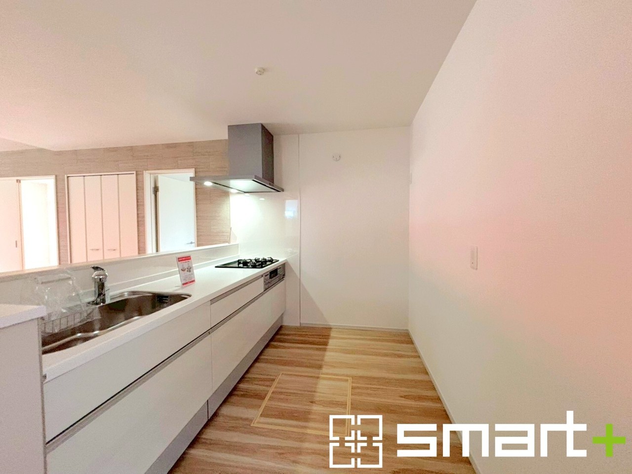 4号棟 ~使い勝手の良いシステムキッチン~ ・料理がしやすい設計のキッチンでお料理もはかどりますね。 ・もちろんキッチン下部は収納になっておりますので、フライパンなども収納可能です。