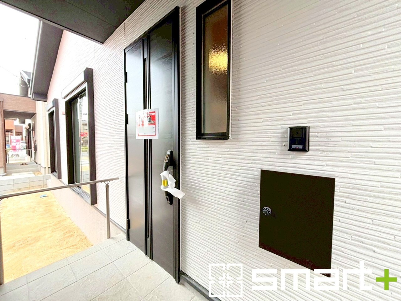 4号棟 ~お住まいの顔「玄関」~ ・玄関ドアの上にはもちろん軒がございますので、雨の日でも濡れずに鍵の開閉が可能です。 ・鍵は防犯性に優れたディンプルキーを採用。