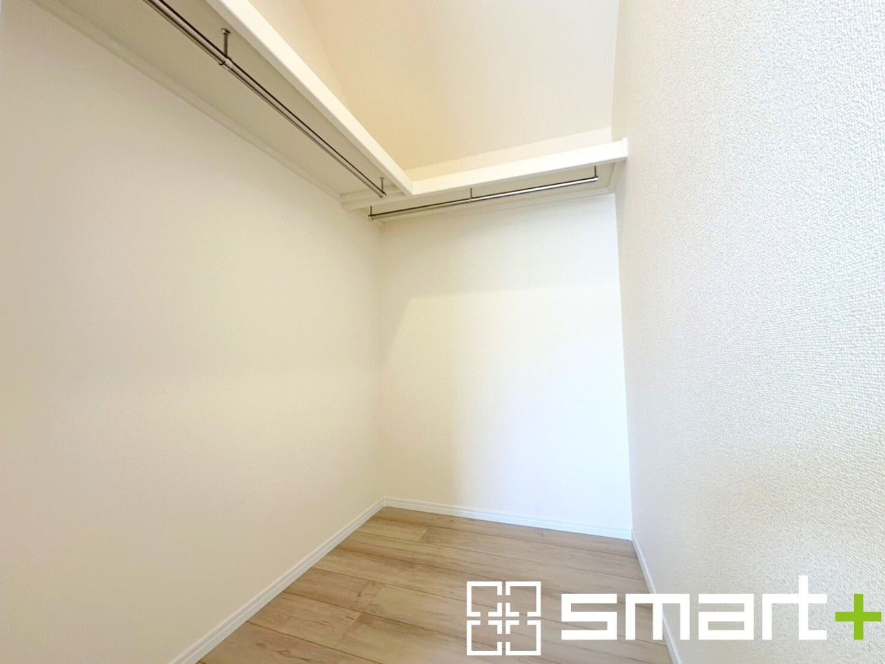 B号棟 ~あると嬉しいウォークインクローゼット~ ・大容量のウォークインクローゼット付。衣類をハンガーに掛けたまま収納できるのがうれしいですね。 ・季節ものや小物類なども整理整頓しやすく生活空間が広がります。