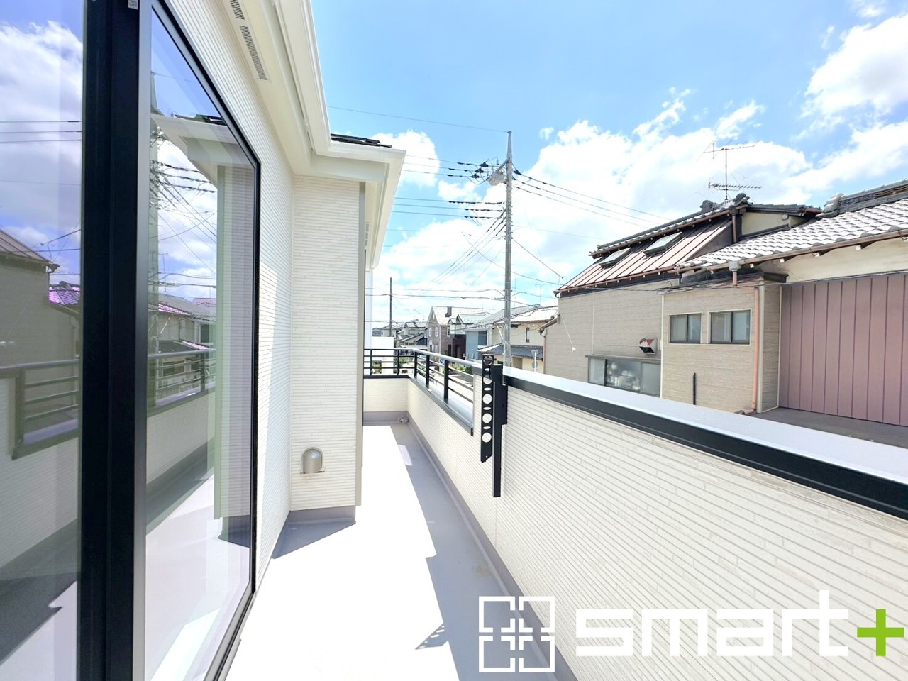 B号棟 ~洗濯物も干しやすいバルコニー~ ・陽当たり良好な南側のバルコニーは2部屋から出入りができて毎日のお洗濯も快適。 ・物干し竿受けが標準装備されております。テラス屋根等のオプションもお気軽にご相談くださいませ。