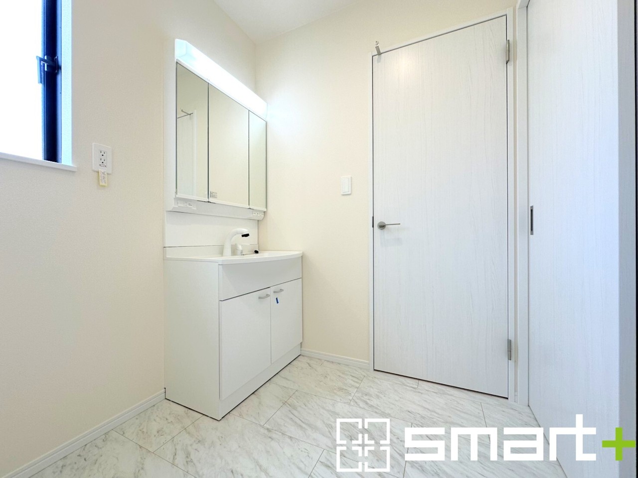 ~人気の三面鏡を採用~ ・洗面台は三面鏡仕様なので鏡の角度を変える事で頭の後ろの方までご確認可能です。 ・鏡の裏が収納になっておりますので、洗面台周りもスッキリと片付きます。