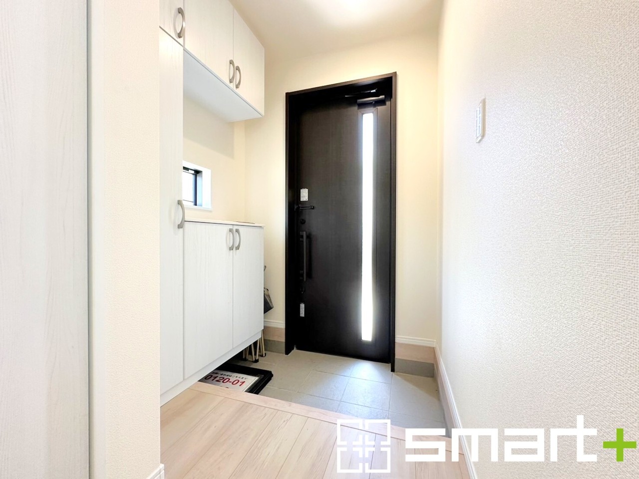 B号棟 ~穏やかな陽が入る玄関~ ・玄関ドアにガラス部分を設ける事で穏やかな陽の入る玄関になります。 ・飾り棚としても演出できるコの字型の下駄箱は大容量の収納力。お気に入りの靴もたっぷりしまえますね。