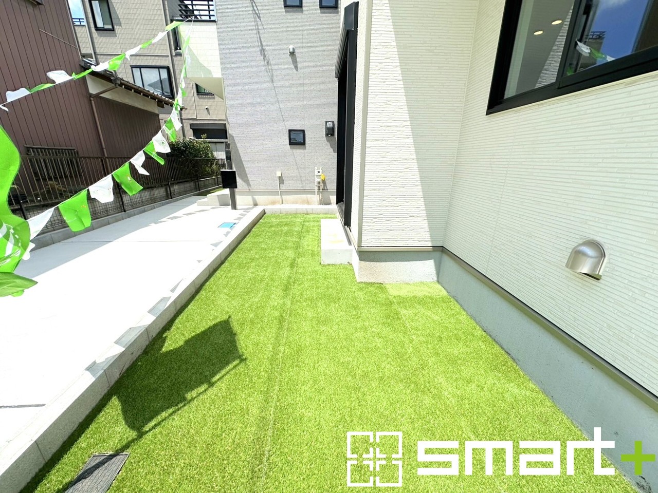 ~人工芝のある綺麗なお庭~ ・標準で人工芝を敷設しておりますので、見た目にも綺麗なお庭となっております。 ・人工芝の場合雑草が生えてこず、管理が楽なのも嬉しいポイントです。