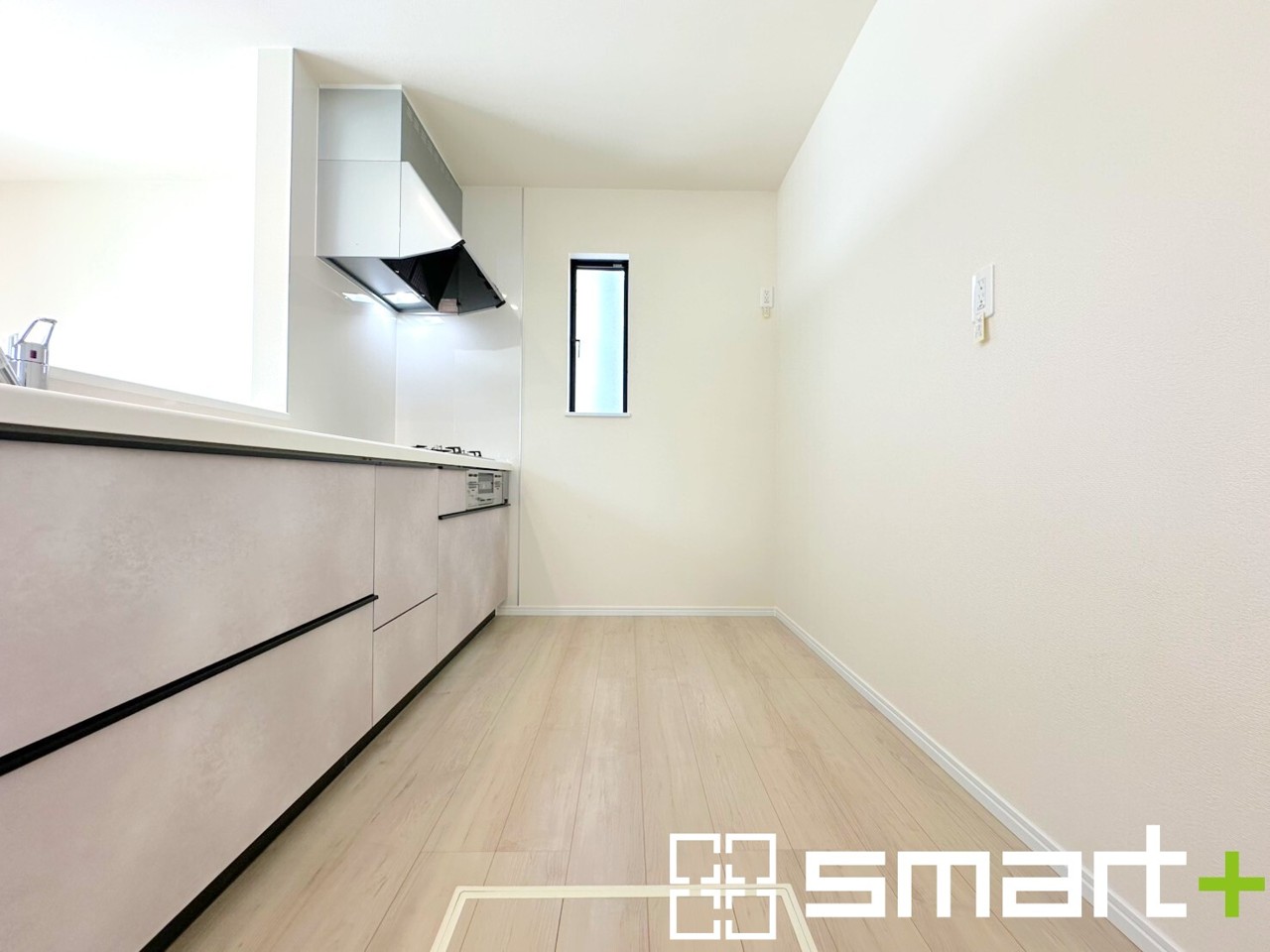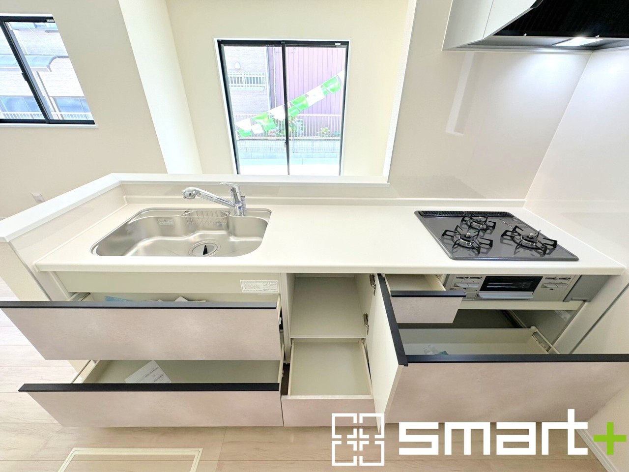 B号棟 ~使い勝手の良いシステムキッチン~ ・料理がしやすい設計のキッチンでお料理もはかどりますね。 ・もちろんキッチン下部は収納になっておりますので、フライパンなども収納可能です。