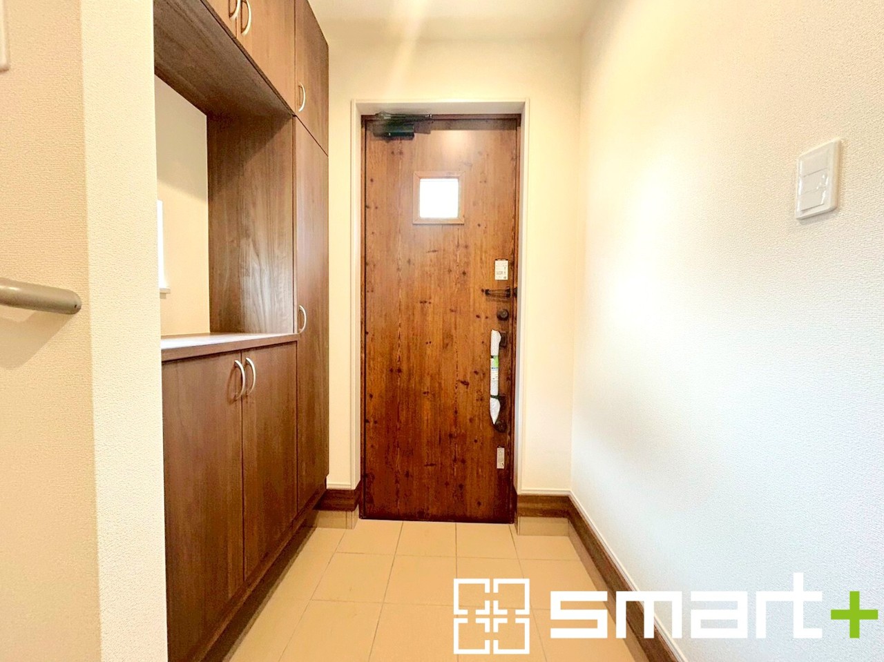 ~デザイン性に優れた玄関~ ・木のぬくもりを感じる木目調の玄関ドアで暖かみのある玄関に。 ・コの字型のシューズボックスは大容量の収納力でお気に入りの靴もたっぷりしまえますね。