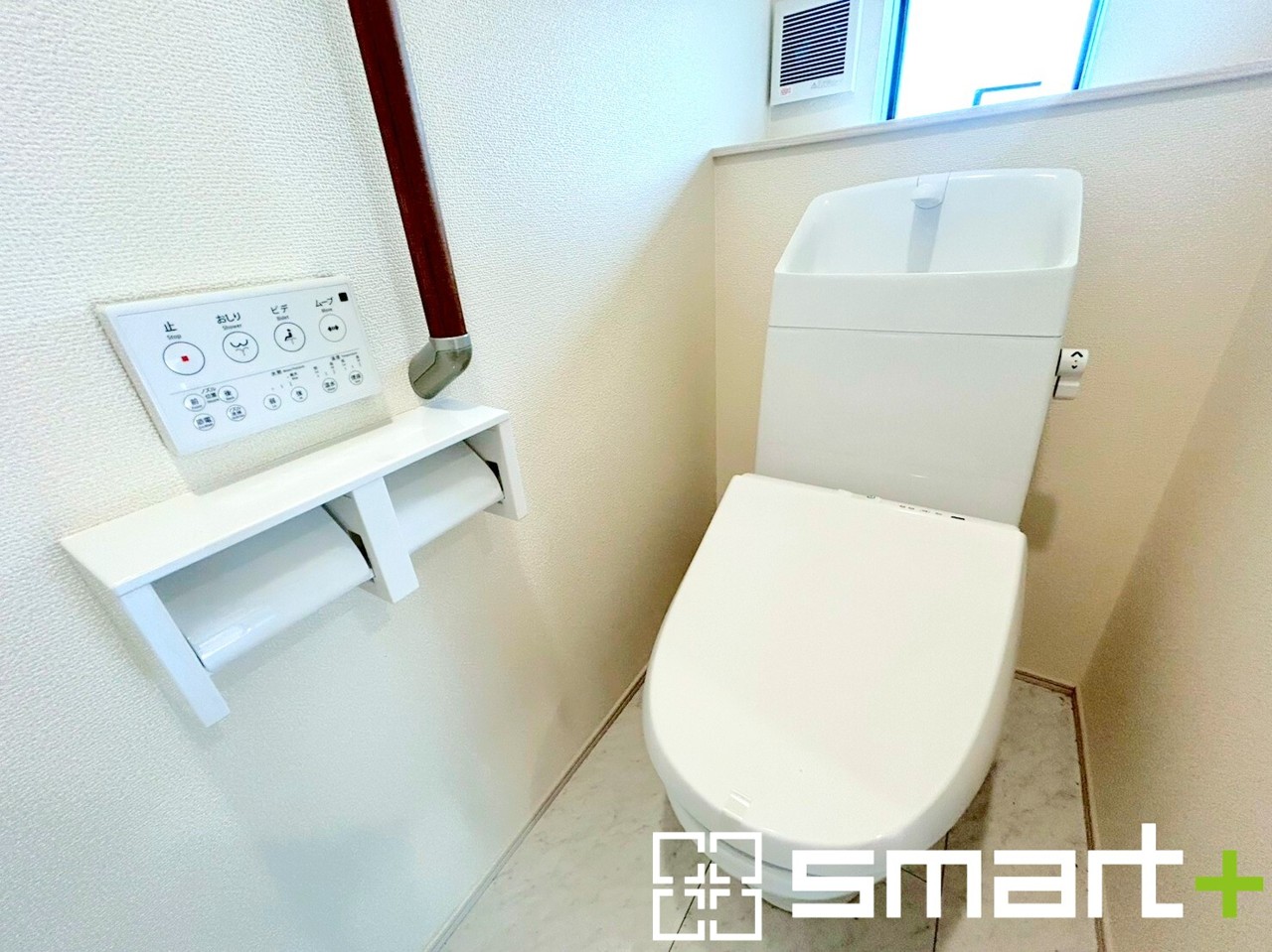 ~窓付きの明るいトイレ~ ・清潔感あるシャワートイレ。窓があるので換気もしやすく快適ですね。 ・背面にある棚はトイレットペーパーなどの置き場や飾り棚としても利用できますね。