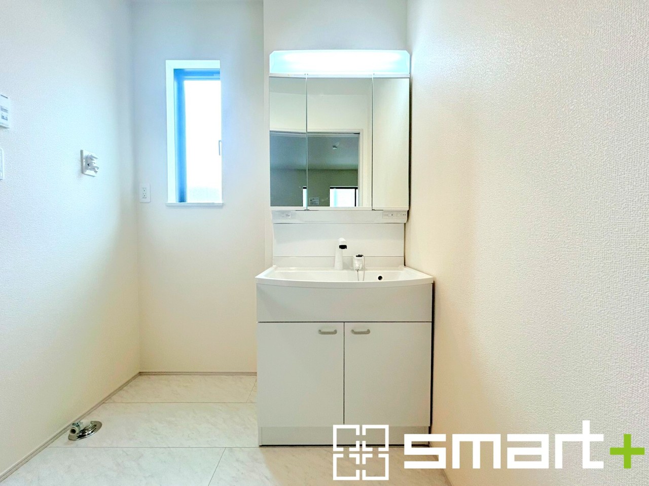 ~明るい洗面スペース~ ・窓から明るい陽が入るので、気持ちよく朝の支度ができますね。 ・使い勝手の良い三面鏡タイプのシャワー付き洗面化粧台。鏡の裏に収納があるので洗面台周りもスッキリ。