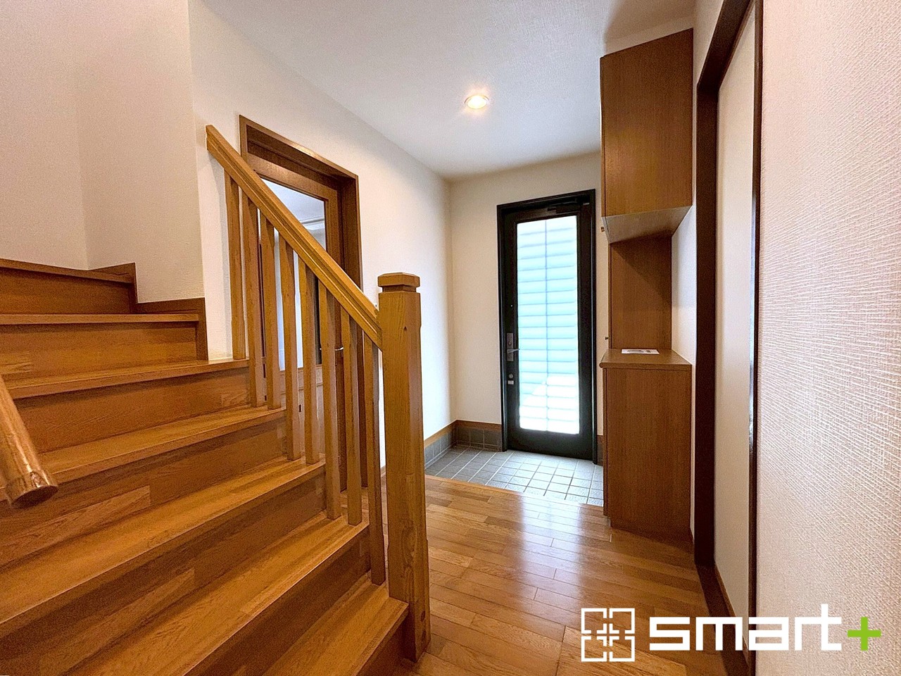 ~穏やかな陽が入る玄関~ ・玄関ドアにガラス部分を設ける事で穏やかな陽の入る玄関になります。 ・飾り棚としても演出できるコの字型の下駄箱は大容量の収納力。