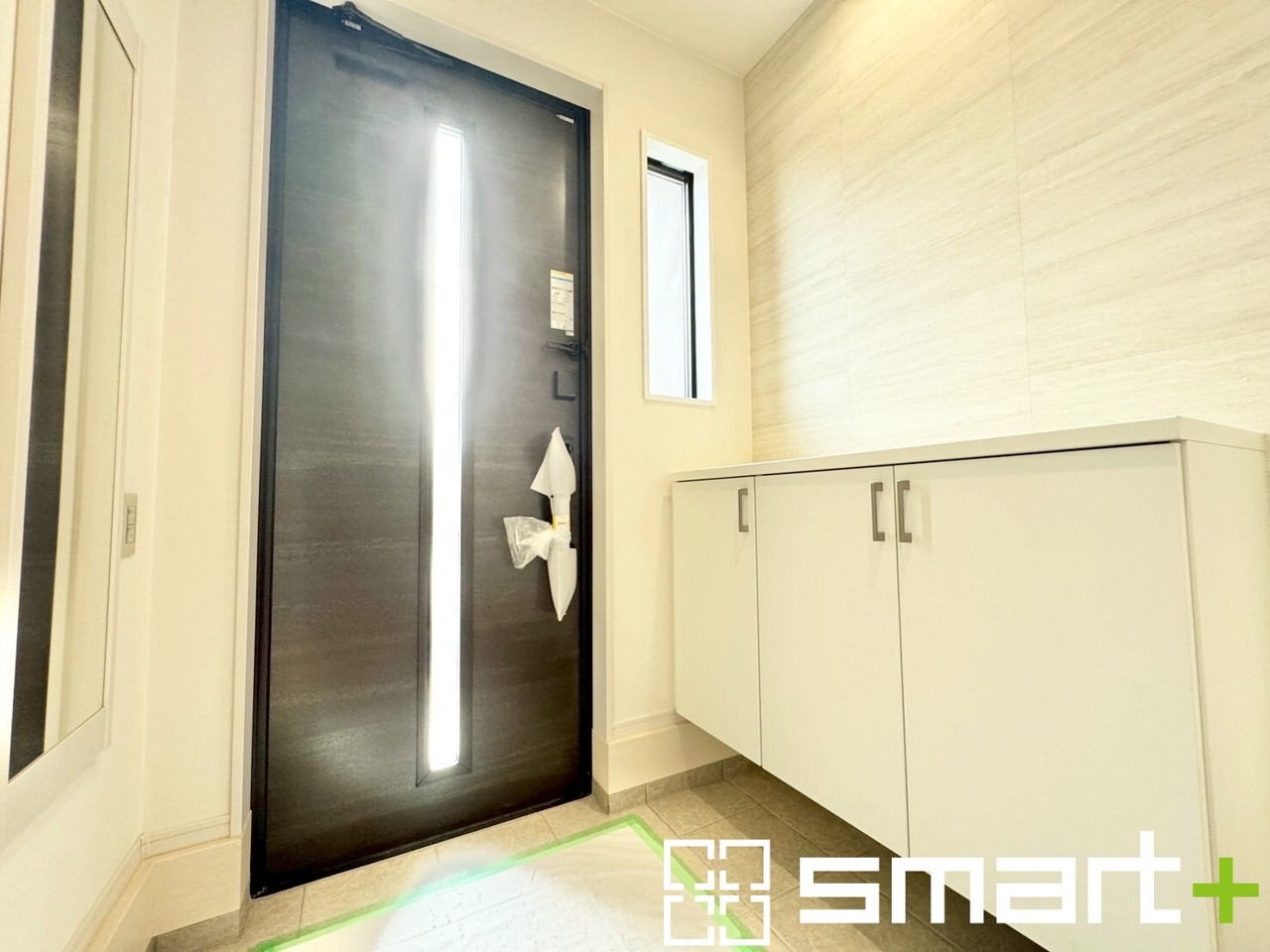 ~穏やかな陽が入る玄関~ ・窓に加えて玄関ドアのガラス部分からも穏やかな陽が入り、明るい玄関になります。 ・備え付けのシューズボックスはたっぷりしまえて玄関がスッキリ片付きますね。