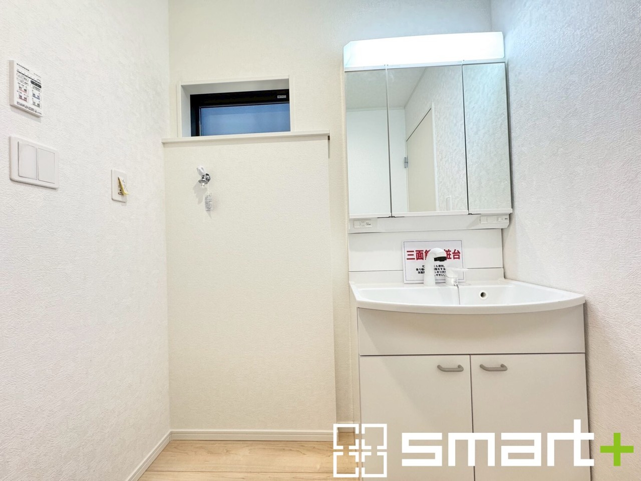 ~人気の三面鏡を採用~ ・洗面台は三面鏡仕様なので鏡の角度を変える事で頭の後ろの方までご確認可能です。 ・鏡の裏が収納になっておりますので、洗面台周りもスッキリと片付きます。