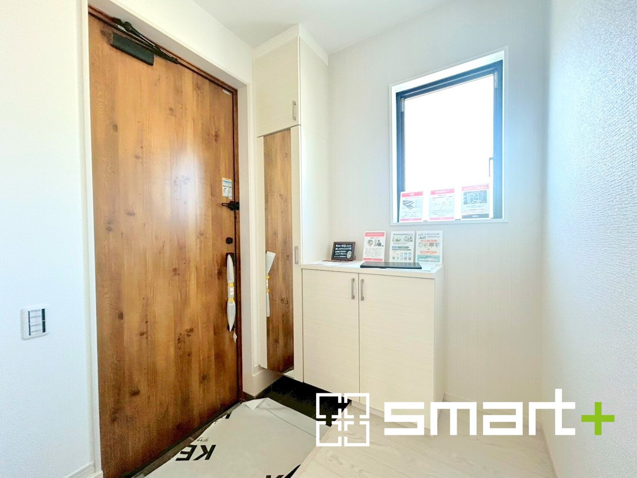 ~明るい玄関でお出迎え~ ・圧迫感がなくスッキリ広々とした印象の玄関。窓からは明るい陽光が差し込みます。 ・備え付けのシューズボックスはミラー付なので朝やお出かけ前の身支度チェックに大活躍。