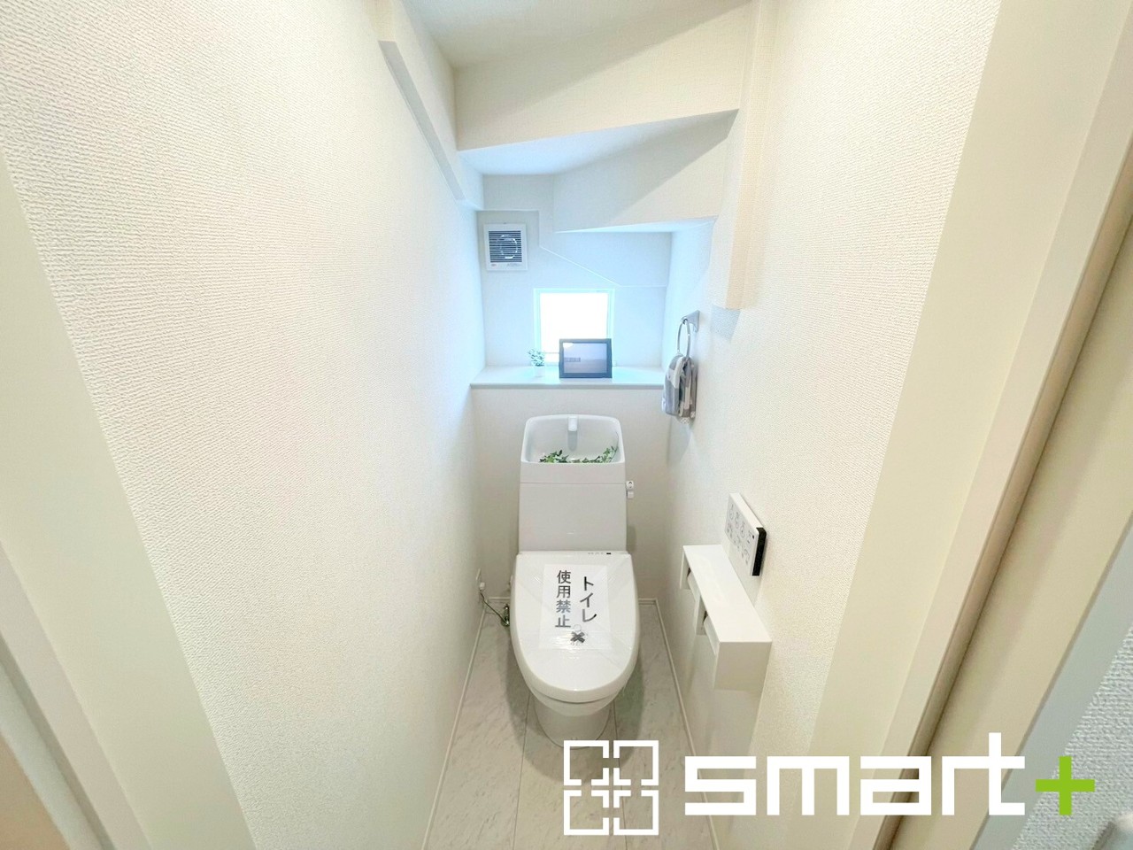 ~窓付きの明るいトイレ~ ・清潔感あるシャワートイレ。窓があるので換気もしやすく快適ですね。 ・背面にある棚はトイレットペーパーなどの置き場や飾り棚としても利用できますね。