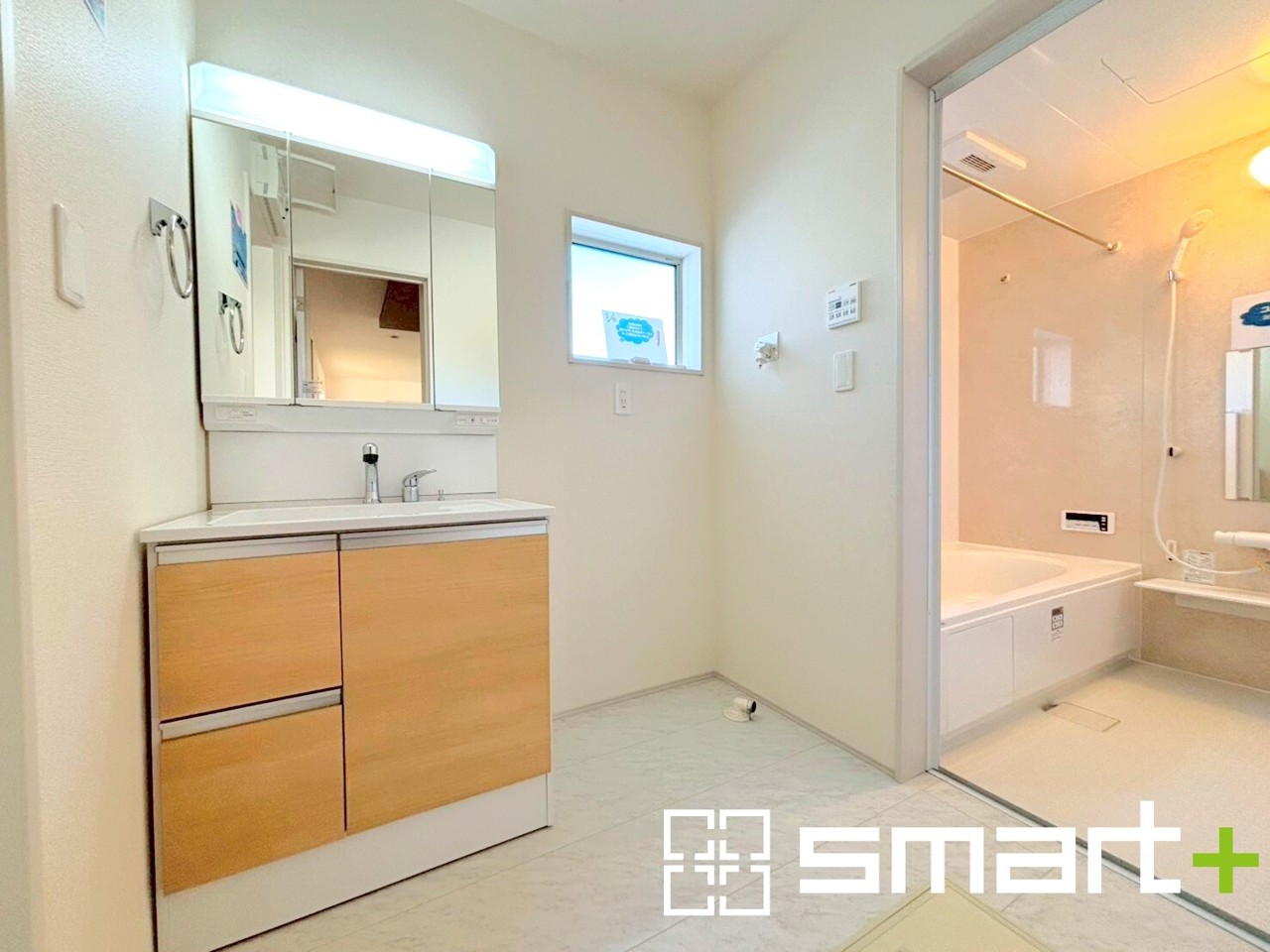 ~明るい洗面スペース~ ・窓から明るい陽が入り、気持ちよく朝の支度ができますね。 ・使い勝手の良い三面鏡タイプのシャワー付き洗面化粧台。鏡の裏に収納があるので洗面台周りもスッキリ。