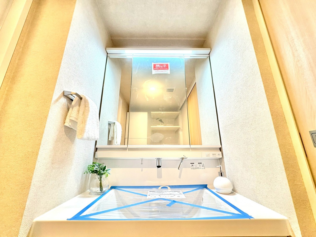 ~人気の三面鏡を採用~ ・洗面台は三面鏡仕様なので鏡の角度を変える事で頭の後ろの方までご確認可能です。 ・鏡の裏が収納になっておりますので、洗面台周りもスッキリと片付きます。