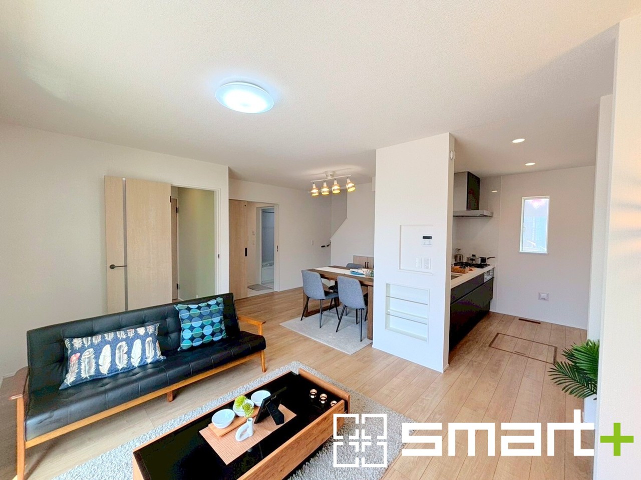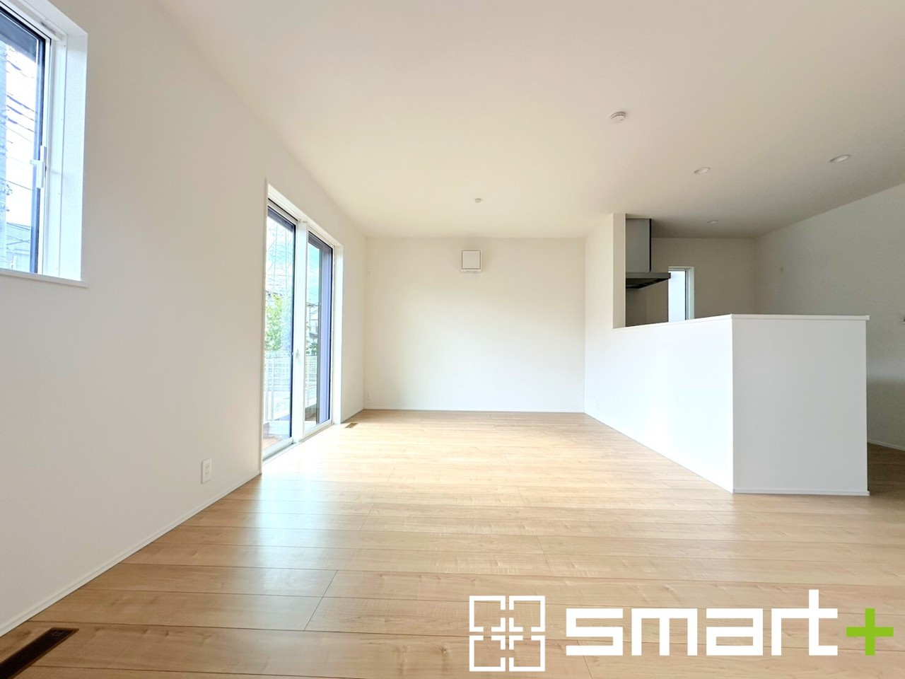 1号棟 ~穏やかな陽の入るLDK~ ・大きな窓のあるLDKは陽当りも良好で明るい空間となっております。 ・ご家族団らんなど過ごす時間の多いLDKが明るいのは嬉しいポイントですね。