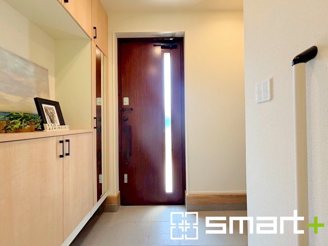 ~穏やかな陽が入る玄関~ ・玄関ドアにガラス部分を設ける事で穏やかな陽の入る玄関になります。 ・備え付けのシューズボックスはミラー付なのでお出かけ前の身支度チェックに大活躍。 (4号棟)