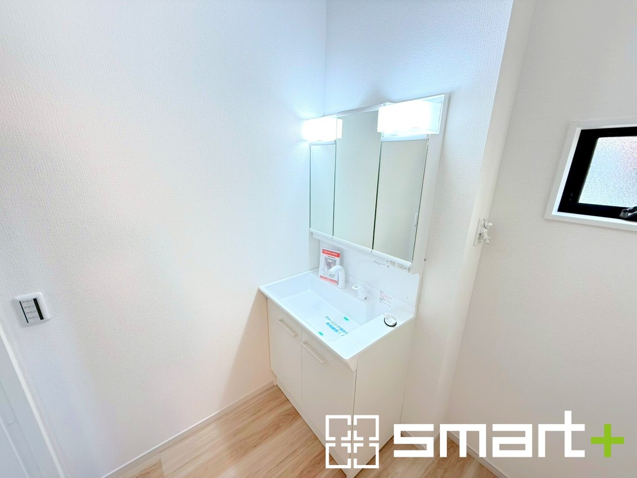 ~人気の三面鏡を採用~ ・洗面台は三面鏡仕様なので鏡の角度を変える事で頭の後ろの方までご確認可能です。 ・鏡の裏が収納になっておりますので、洗面台周りもスッキリと片付きます。