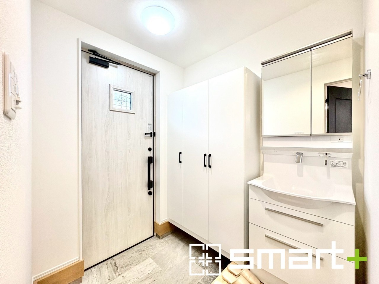 A号棟 ~玄関にも洗面台~ ・玄関に洗面台を設置することで、帰宅後すぐに手洗いができるのも嬉しいですね。 ・清潔感のあるホワイトカラーで纏められた玄関は圧迫感もなく広々とした印象に。