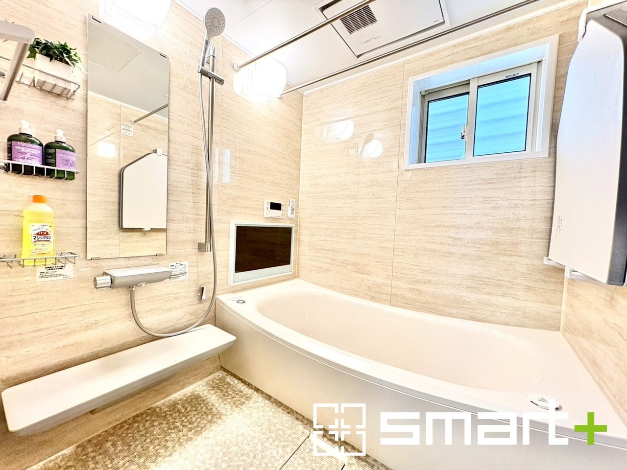 ~22型テレビ付きの浴室~ ・浴室には乾燥機が付いているので雨の日でも洗濯物を干すことが可能です。 ・水はけの良い床材など機能面も充実。マイクロバブルなどオプションもご相談くださいませ。 (A号棟)