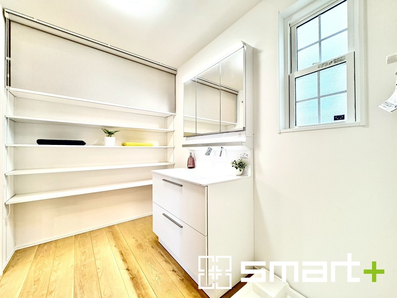 A号棟 ~収納も充実の洗面所~ ・洗面所にはリネンスペースを設ける事でタオルや洗剤などの置場にも困りません。 ・意外とリネンスペースがある物件は少ないので、ぜひ現地でその魅力をご確認ください。