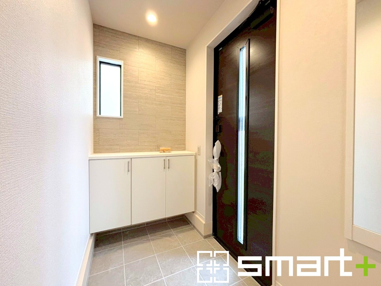 ~穏やかな陽の入る玄関~ ・玄関ドアのガラス部分に加えてシューズボックスの間に窓を設ける事で穏やかな陽の入る玄関に。 ・ご家族やご来客を明るい空間で出迎えてくれます。