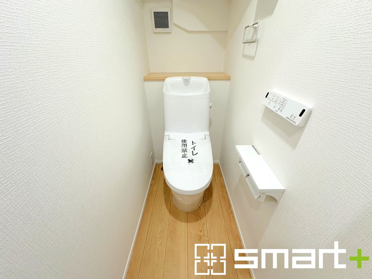 ~窓付きの明るいトイレ~ ・清潔感あるシャワートイレ。窓があるので換気もしやすく快適ですね。 ・背面にある棚はトイレットペーパーなどの置き場や飾り棚としても利用できますね。