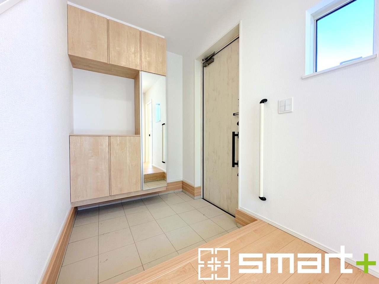 ~明るい玄関でお出迎え~ ・圧迫感がなくスッキリ広々とした印象の玄関。窓からは明るい陽光が差し込みます。 ・備え付けのシューズボックスはミラー付なので朝やお出かけ前の身支度チェックに大活躍。