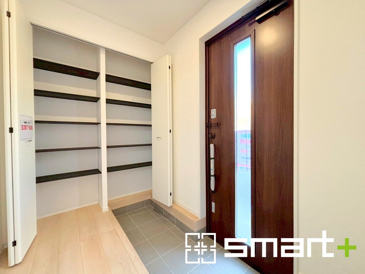 ~穏やかな陽が入る玄関~ ・玄関ドアにガラス部分を設ける事で穏やかな陽の入る玄関になります。 ・備え付けのシューズボックスは充分な便利な稼働式の棚で高さのあるものもスッキリしまえて快適。