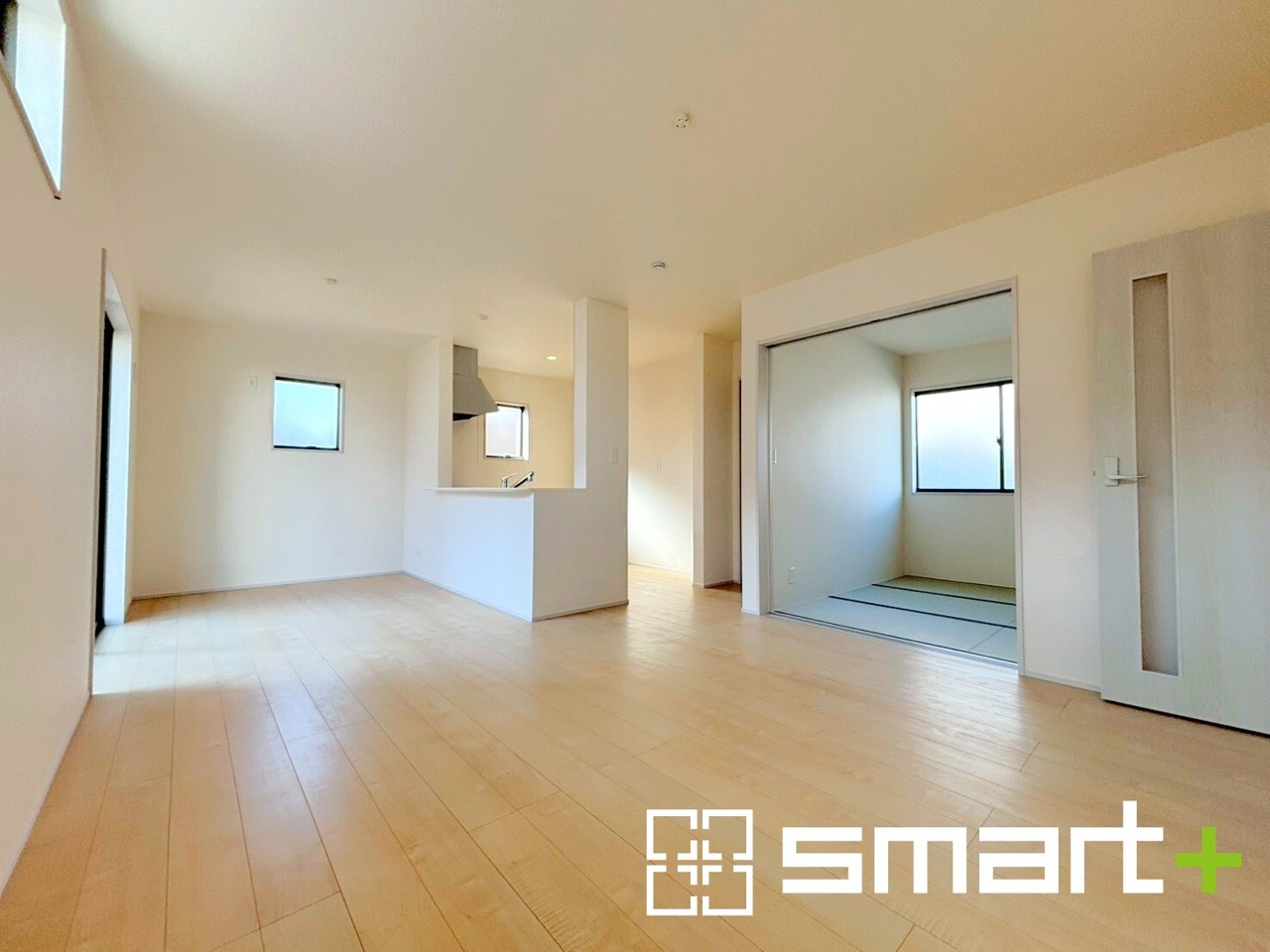 2号棟 ~家族団らんにピッタリの広々リビング~ ・自然の光が降り注ぐ明るいLDKは家族団らんにピッタリ。 ・隣接の和室を続き間として利用すれば20帖超の広々空間になります。