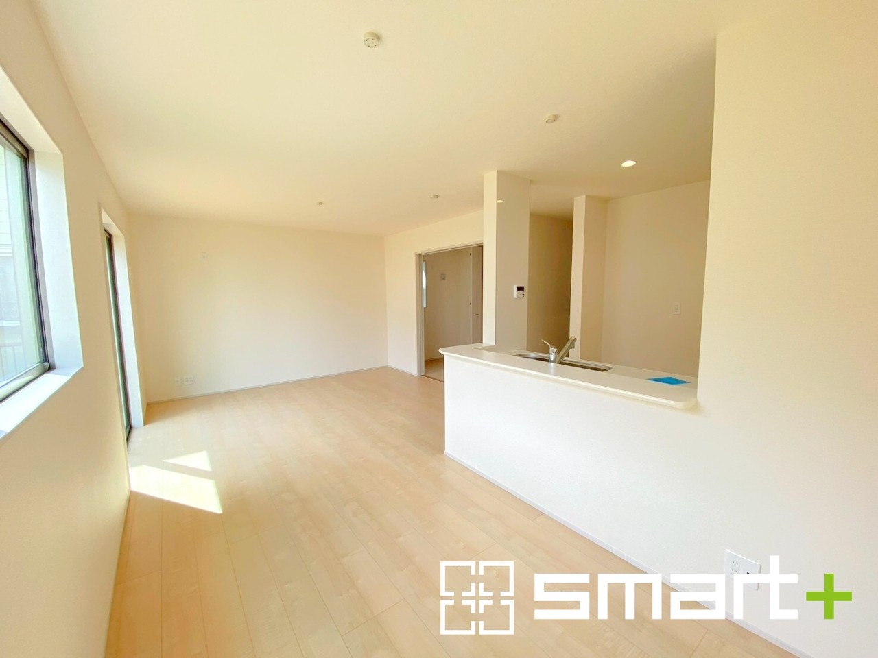8号棟 ~窓からはたっぷりの陽光~ ・穏やかな陽だまりに包まれる居心地の良いLDKは、ご家族が自然と集まる憩いのスペースに。 ・家事をしながらご家族との会話が楽しめる人気のカウンターキッチンも魅力。
