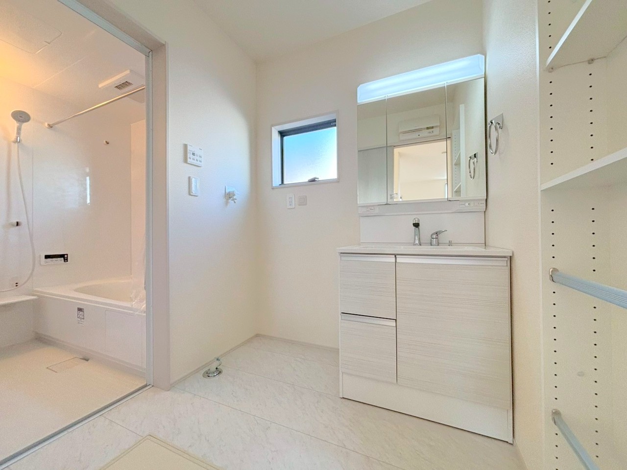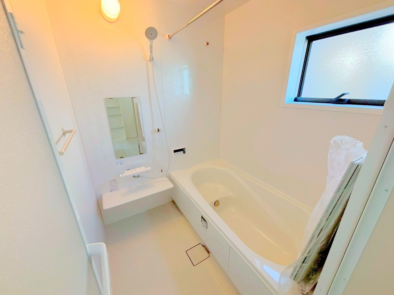 ~浴室乾燥機付きの浴室~ ・浴室には乾燥機が付いているので雨の日でも洗濯物を干すことが可能です。 ・水はけの良い床材など機能面も充実。マイクロバルなどオプションもご相談くださいませ。 (2号棟)