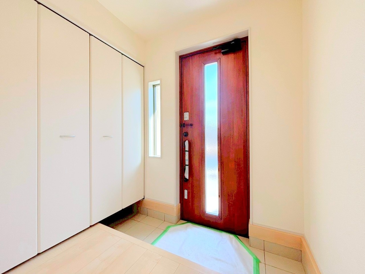 ~圧迫感のない明るい玄関~ ・窓に加えて玄関ドアのガラス部分からも穏やかな陽が入り、明るい玄関になります。 ・備え付けのシューズボックスはたっぷりしまえて玄関がスッキリ片付きますね。 (2号棟)