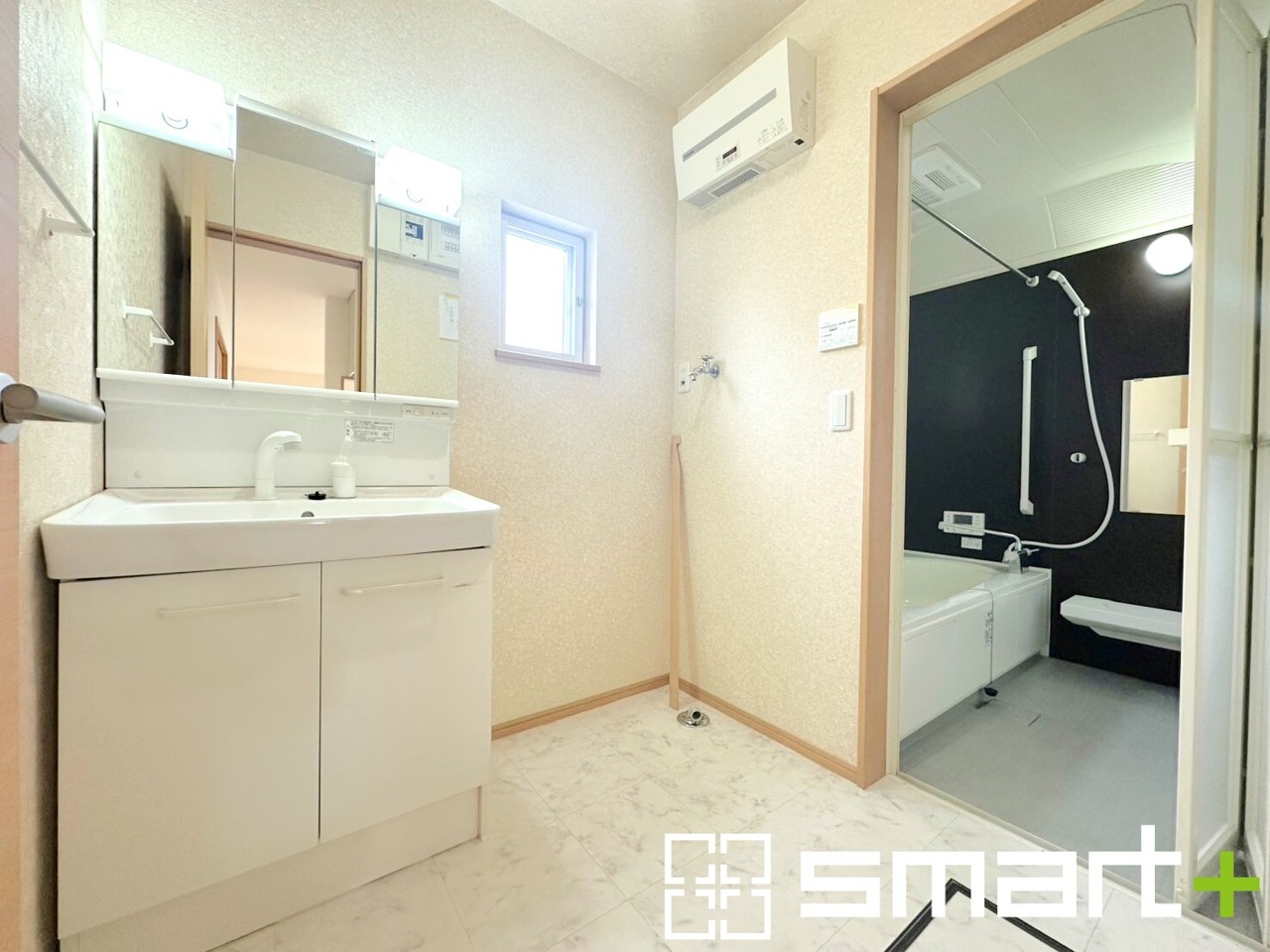 ~人気の三面鏡を採用~ ・洗面台は三面鏡仕様なので鏡の角度を変える事で頭の後ろの方までご確認可能です。 ・鏡の裏が収納になっておりますので、洗面台周りもスッキリと片付きます。