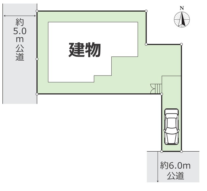 | 接道 | 西側5M公道に接道 南東側6M公道に接道 |