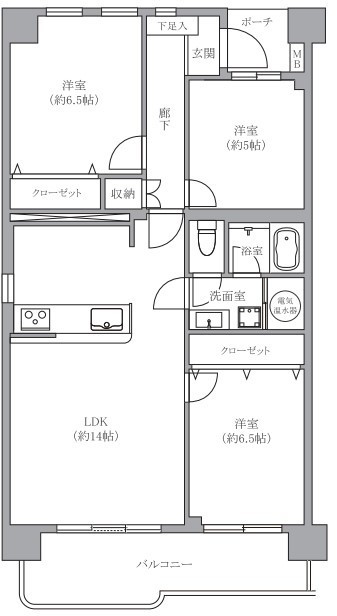| 間取 | 3LDK (LDK14帖、洋室6.5帖、洋室6.5帖、洋室5帖) | ||