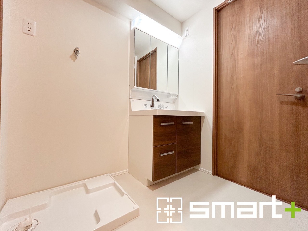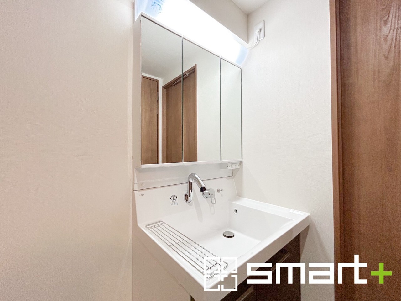 ~シャワー付き洗面化粧台~ ・新品交換した洗面化粧台はシャワー付きなので、寝ぐせ直しや洗面ボウルのお掃除にも便利です。 ・使い勝手の良い三面鏡タイプも嬉しいですね。