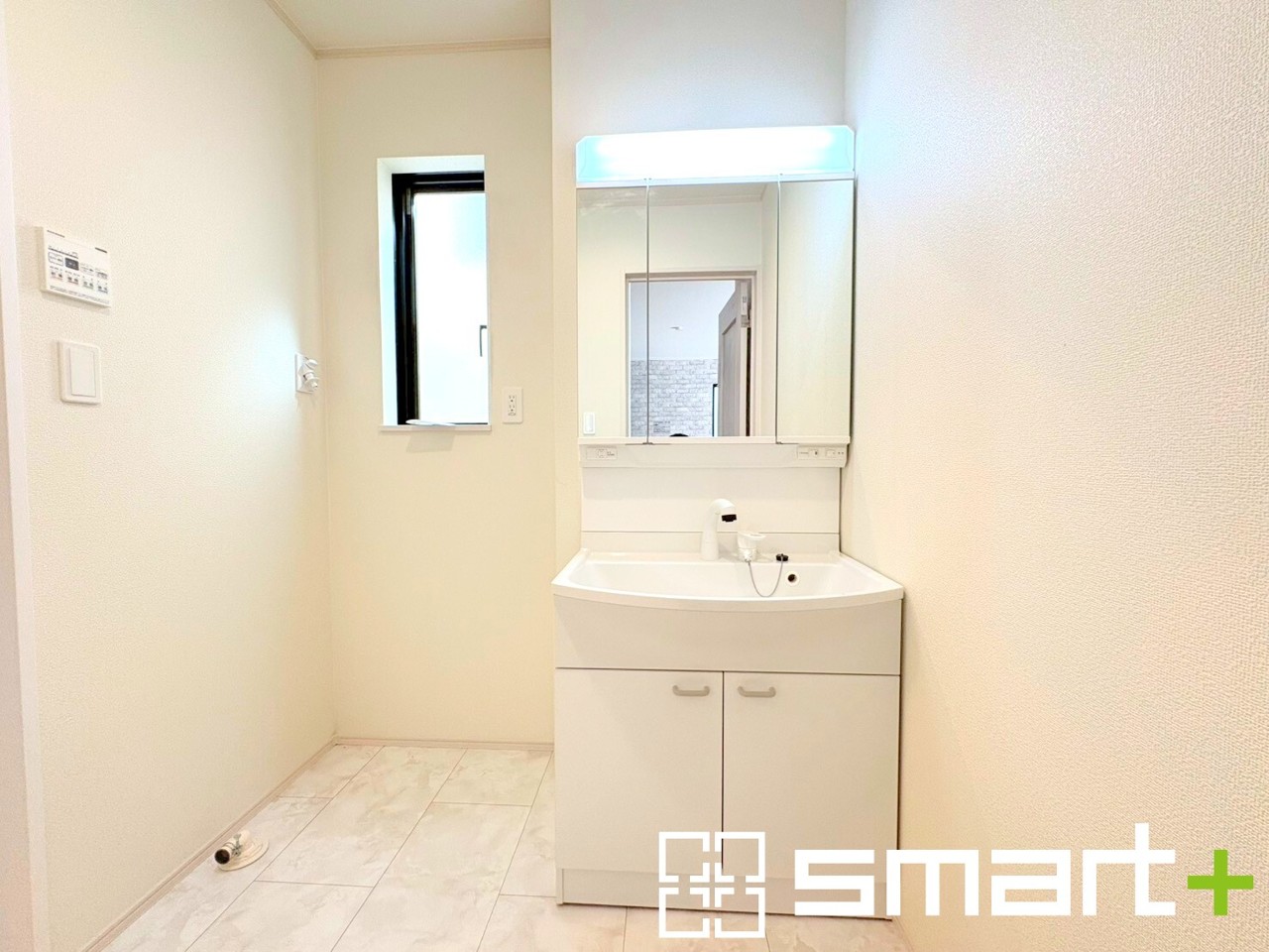 ~明るい洗面スペース~ ・窓から明るい陽が入るので、気持ちよく朝の支度ができますね。 ・使い勝手の良い三面鏡タイプのシャワー付き洗面化粧台。鏡の裏に収納があるので洗面台周りもスッキリ。