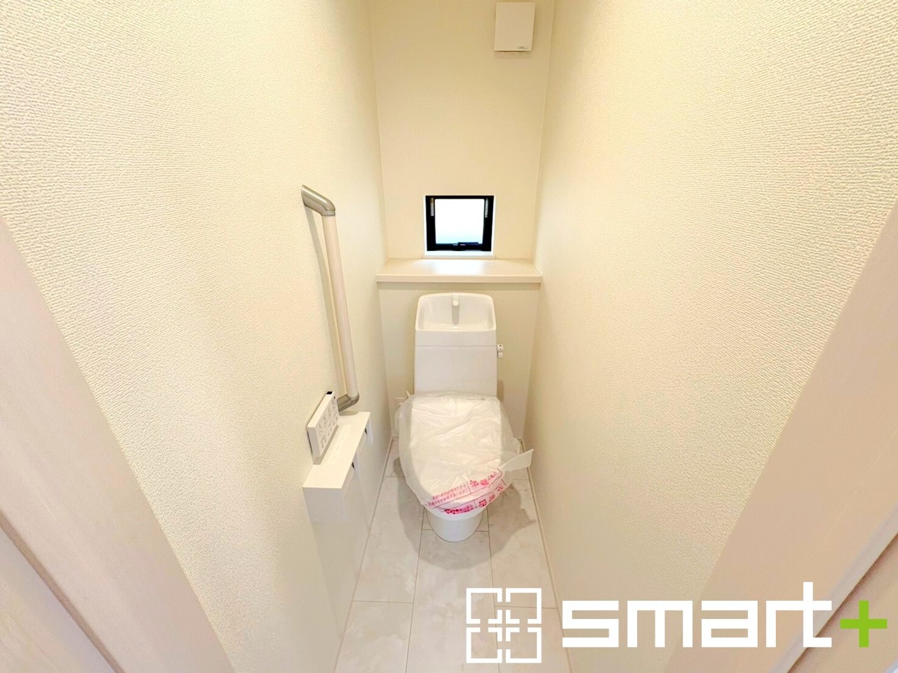 ~窓付きの明るいトイレ~ ・清潔感あるシャワートイレ。窓があるので換気もしやすく快適ですね。 ・背面にある棚はトイレットペーパーなどの置き場や飾り棚としても利用できますね。
