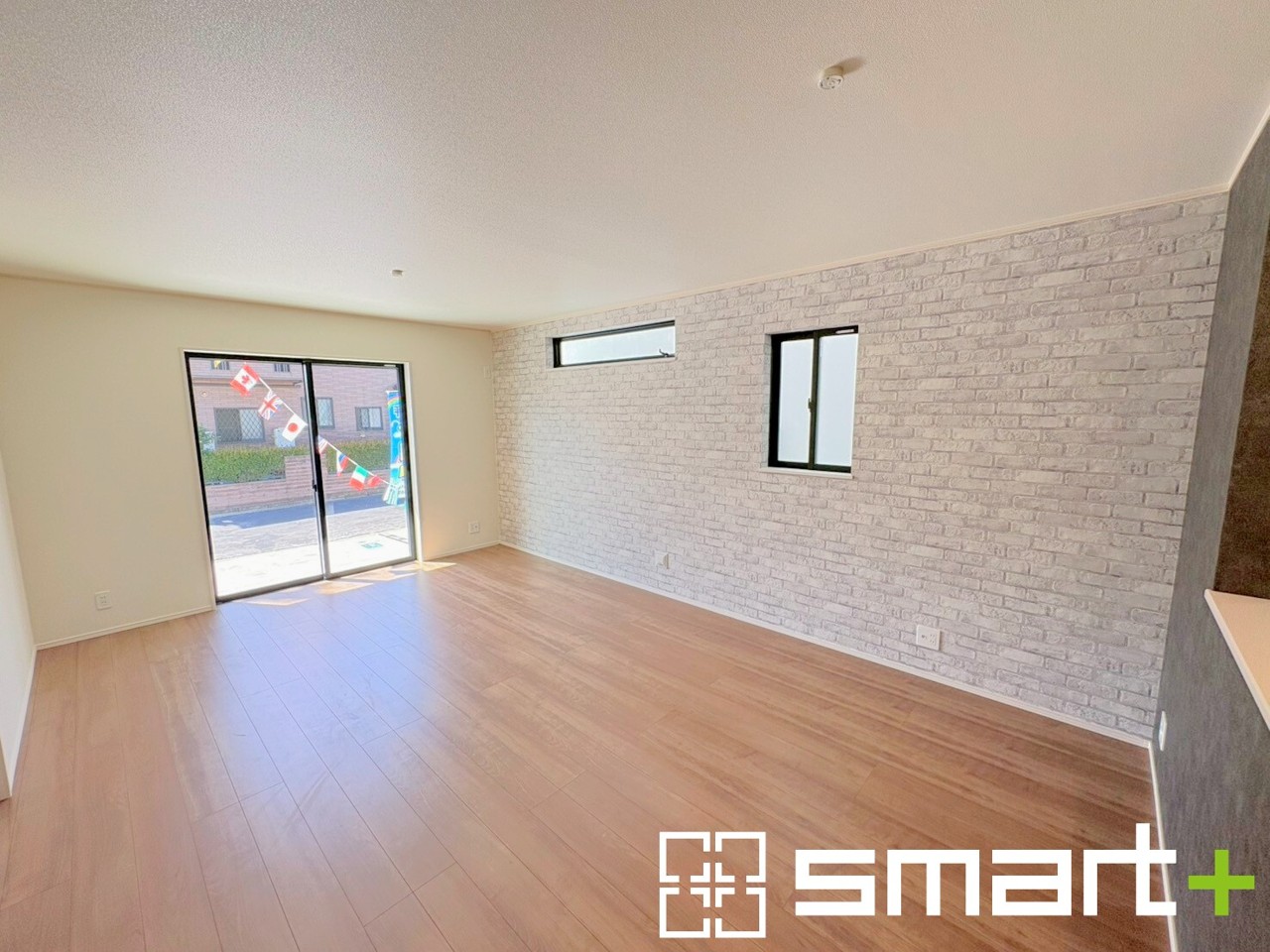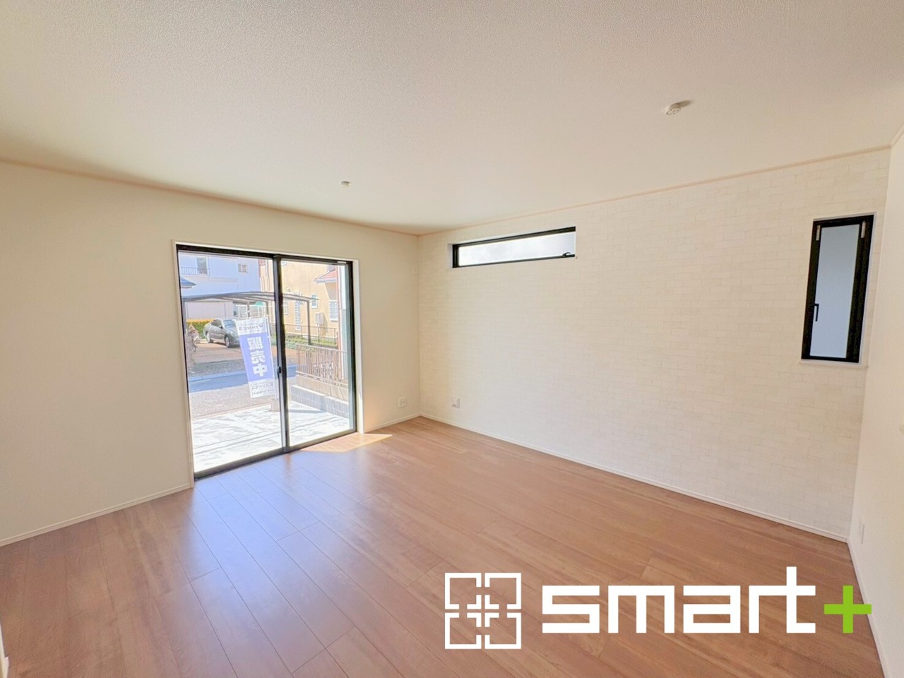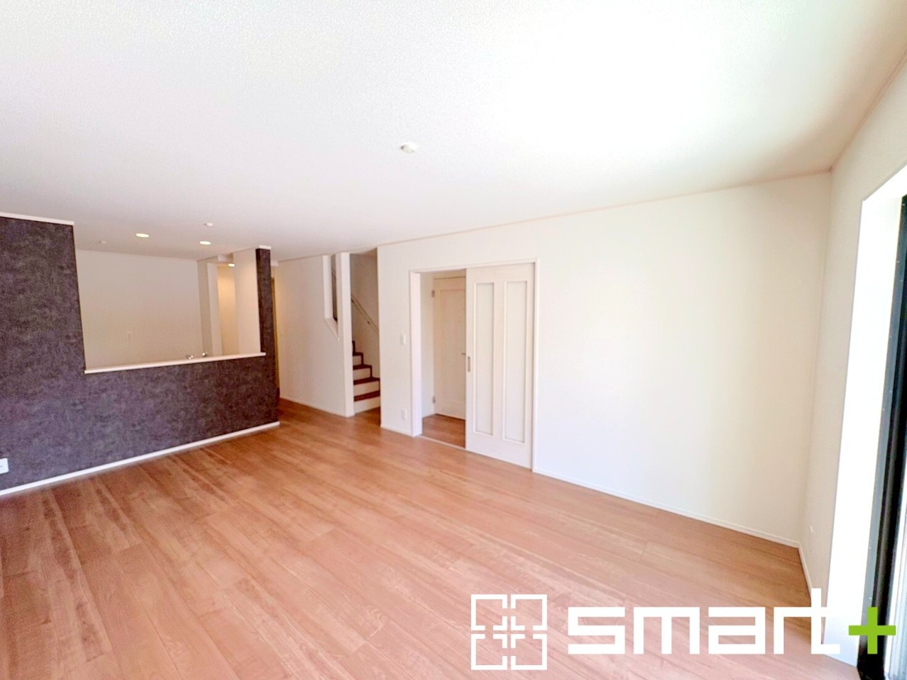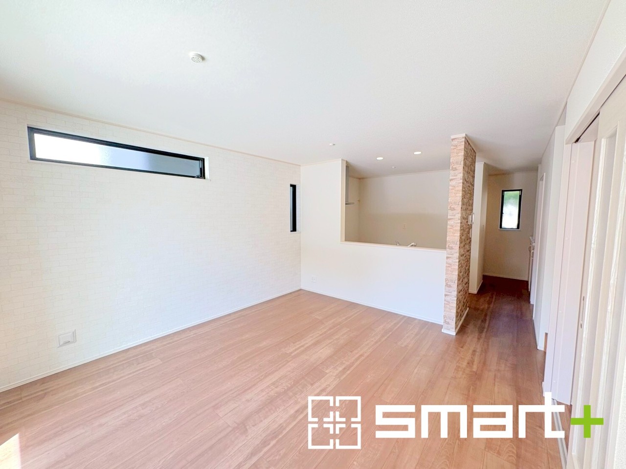 B号棟 ~穏やかな陽の入るLDK~ ・ご家族でゆったり寛げる広々リビングは、大きな窓からたっぷりの陽光が差し込む明るい空間。 ・アクセントクロスでシンプルなお部屋もメリハリのある空間に。