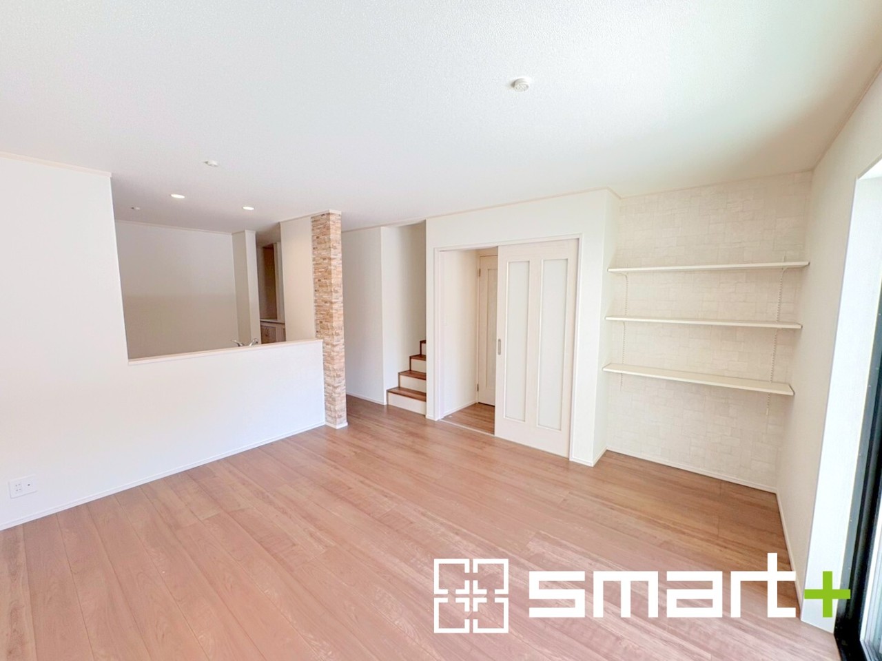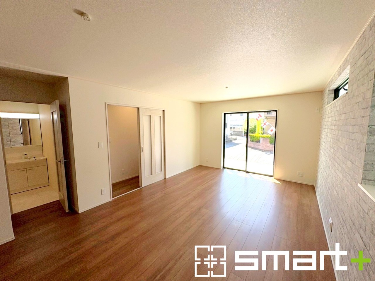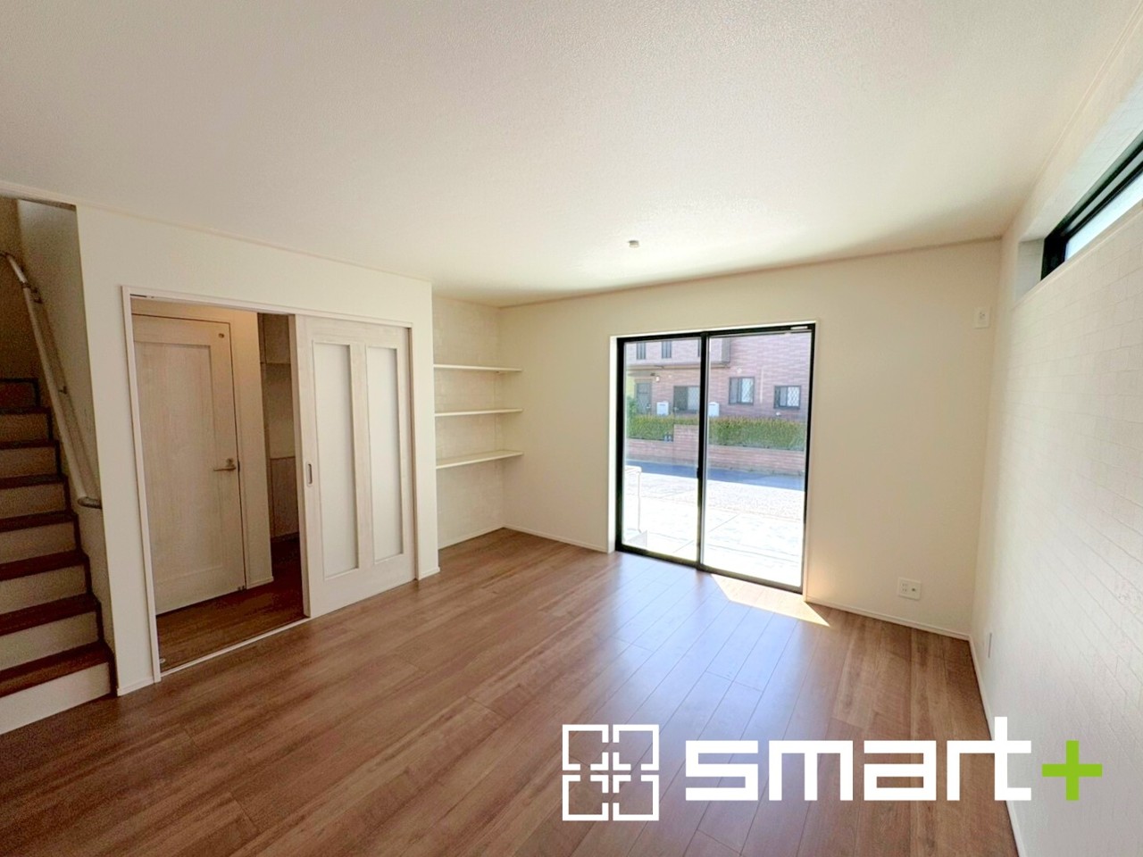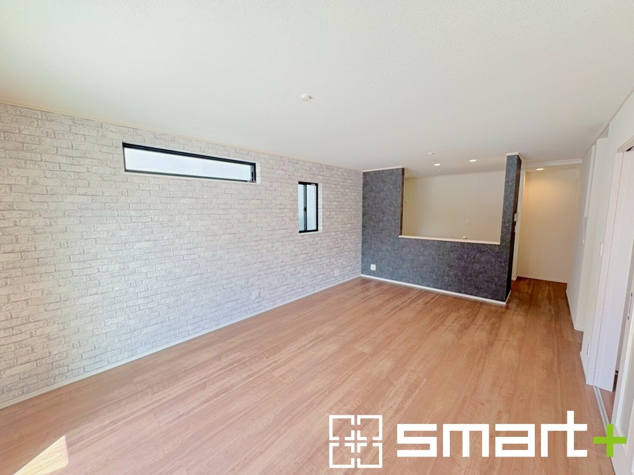 B号棟 ~穏やかな陽の入るLDK~ ・ご家族でゆったり寛げる広々リビングは、大きな窓からたっぷりの陽光が差し込む明るい空間。 ・アクセントクロスでシンプルなお部屋もメリハリのある空間に。