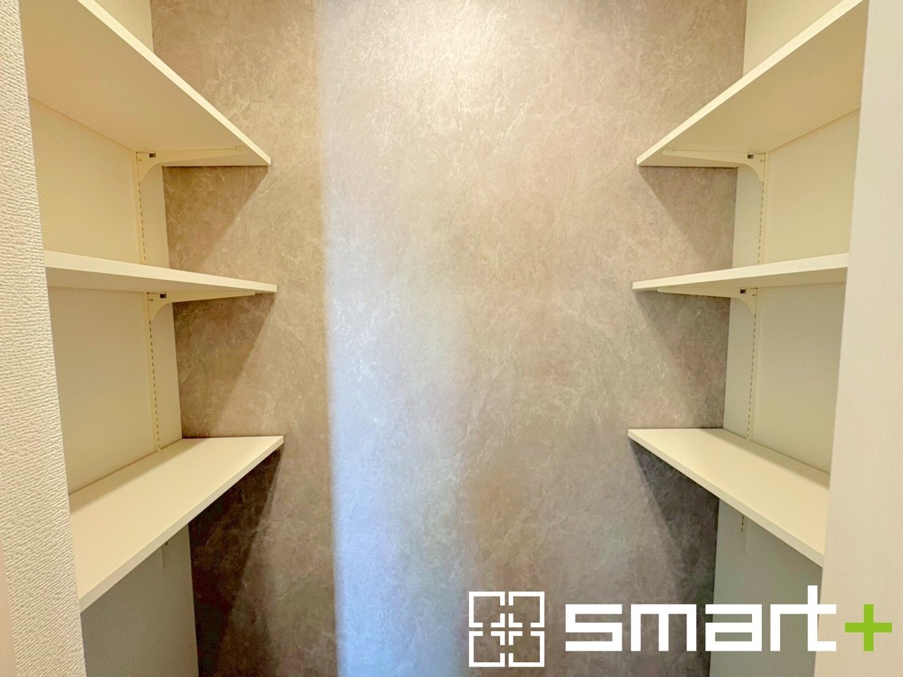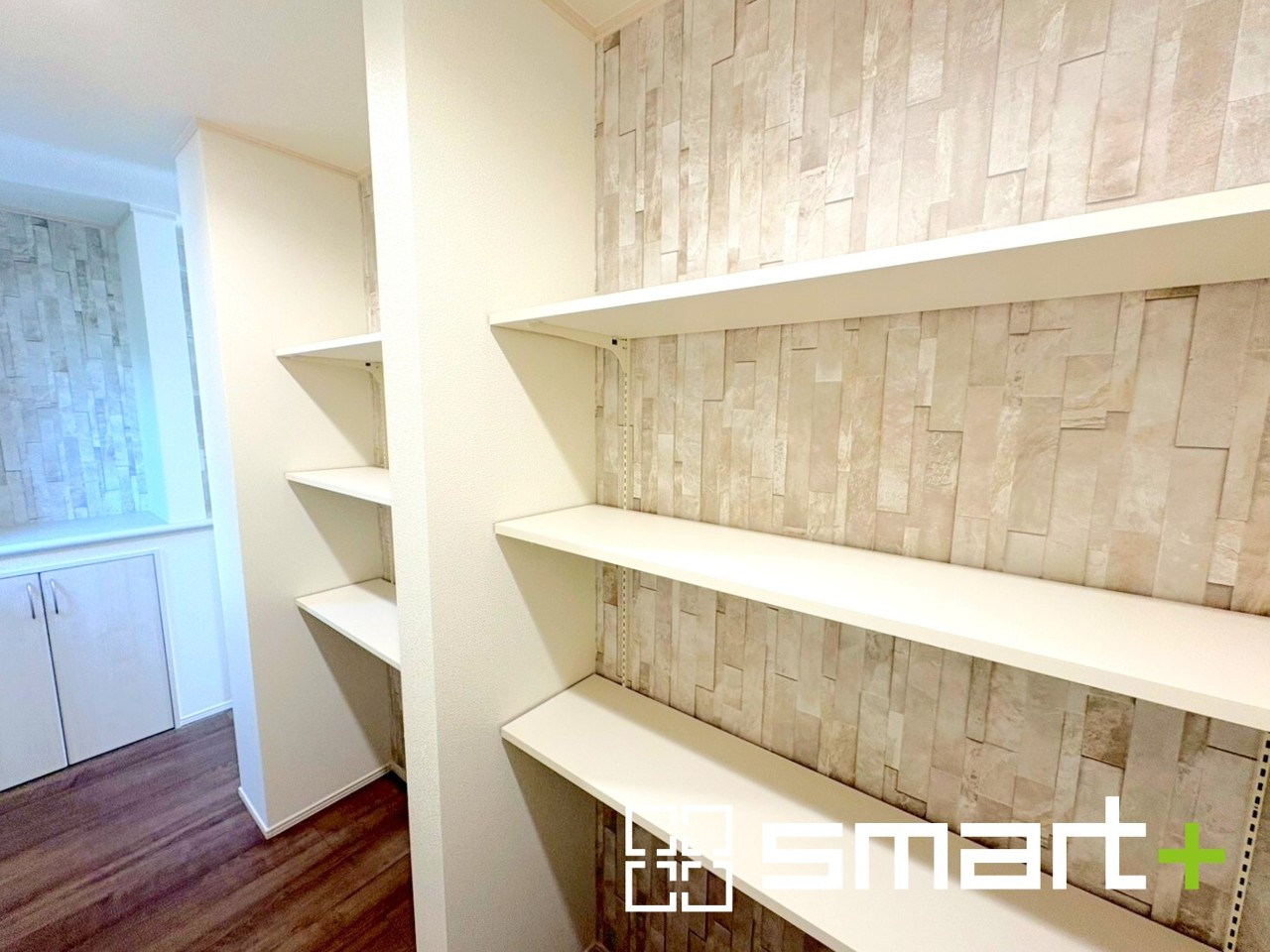 ~あると嬉しい収納スペース~ ・キッチン横にはママに嬉しいパントリー付。食材や台所用品のストックもたくさん出来ます。 ・散らかりがちなキッチン周りがスッキリ片付いて毎日の家事も快適。 (A号棟)