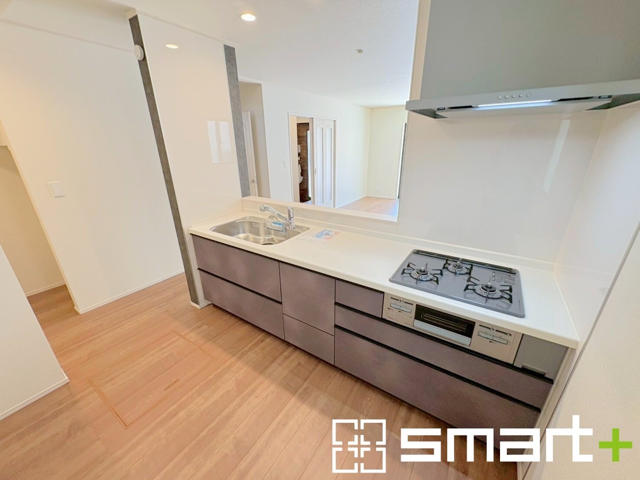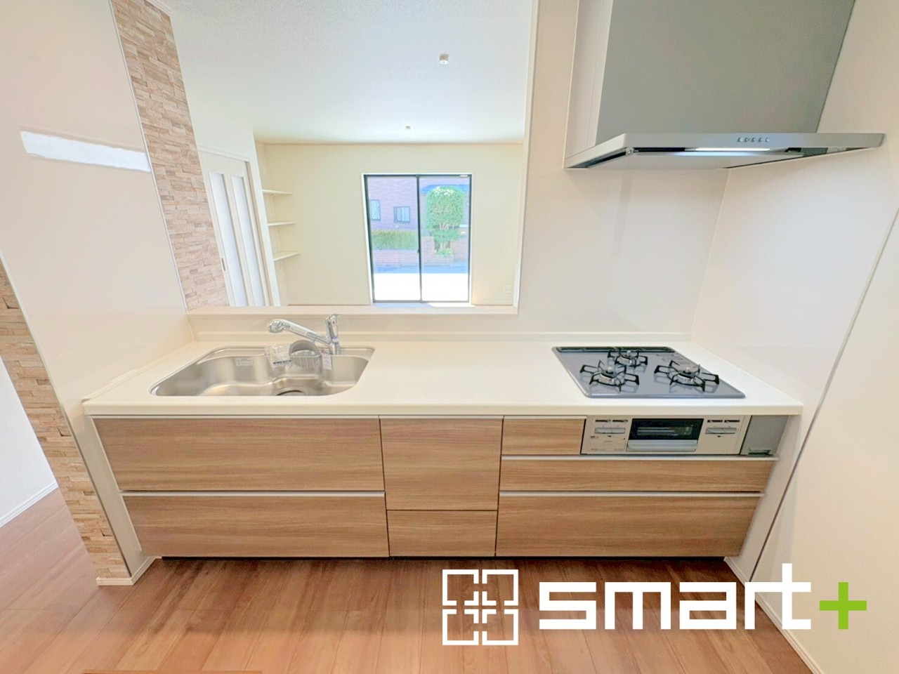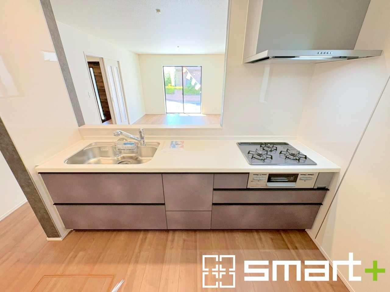 B号棟 ~使い勝手の良いシステムキッチン~ ・料理がしやすい設計のキッチンでお料理もはかどりますね。 ・もちろんキッチン下部は収納になっておりますので、フライパンなども収納可能です。