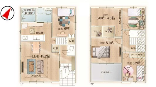 | 間取 | 4LDK + WIC×2 (LDK18.2帖、洋室11.3帖、洋室8.1帖、洋室6帖、洋室5.1帖) | ||