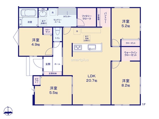 | 間取 | 4LDK + WIC、パントリー、ファミリークローク (LDK20.7帖、洋室8.2帖、洋室5.5帖、洋室5.2帖、洋室4.9帖) | ||