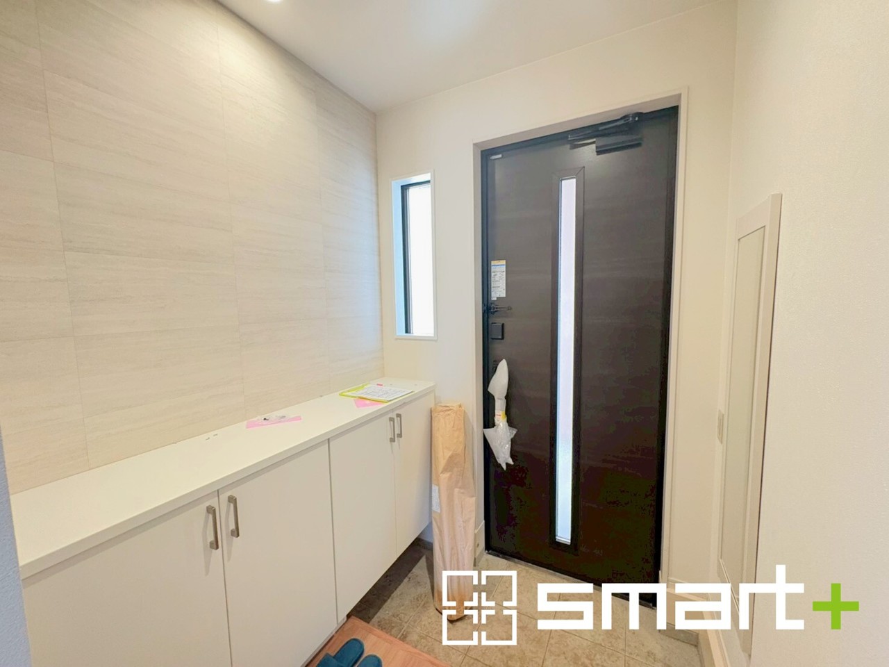 ~穏やかな陽が入る玄関~ ・窓に加えて玄関ドアのガラス部分からも穏やかな陽が入り、明るい玄関になります。 ・備え付けのシューズボックスはたっぷりしまえて玄関がスッキリ片付きますね。