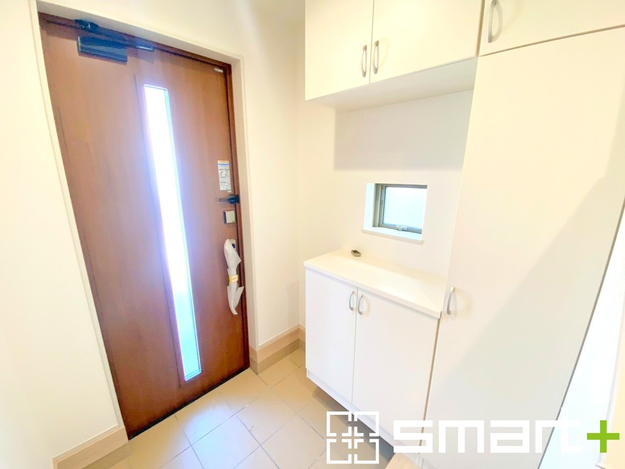 ~穏やかな陽が入る玄関~ ・玄関ドアにガラス部分を設ける事で穏やかな陽の入る玄関になります。 ・飾り棚としても演出できるコの字型の下駄箱は大容量の収納力。
