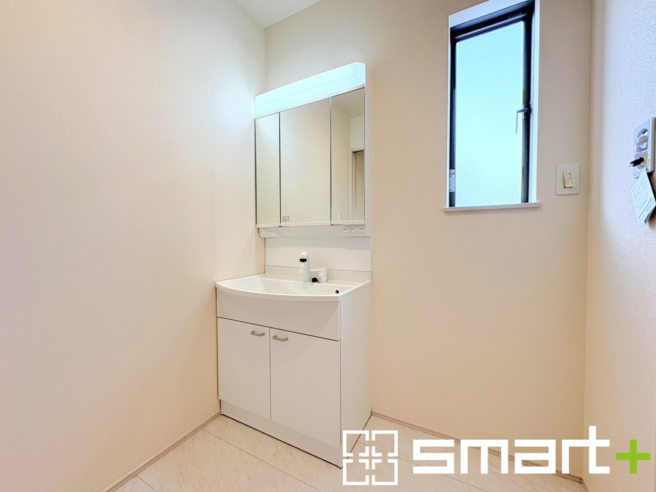 ~明るい洗面スペース~ ・窓から明るい陽が入り、気持ちよく朝の支度ができますね。 ・使い勝手の良い三面鏡タイプのシャワー付き洗面化粧台。鏡の裏に収納があるので洗面台周りもスッキリ。
