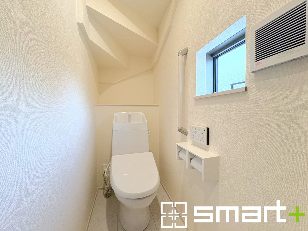 ~窓付きの明るいトイレ~ ・使用後や掃除の際に窓を開ければ、外からの新鮮な空気を取り込み素早く換気ができます。 ・埋め込み収納付きでストックや掃除用具もスッキリ片付きますね。